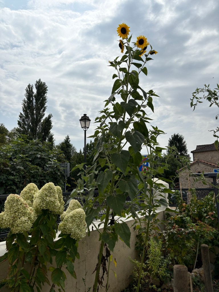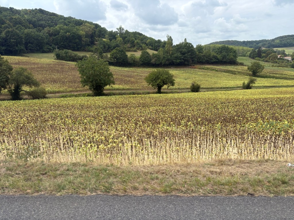 Leaving Toulouse (Friday morning) on the regional train with all our luggage, the first ride was uneventful…until we arrived at Agen, the station where we change to the little train to Monsempron libos and back to Fumel familiarity, for me at least! Carolyn’s first foray into France and out the windows were the fields of, now ready for harvesting, tournesols (sunflowers) ….. bending their drying out heads in the still slightly overcast day. I still cannot imagine how sunflower oil is extracted from these dry old seeds!