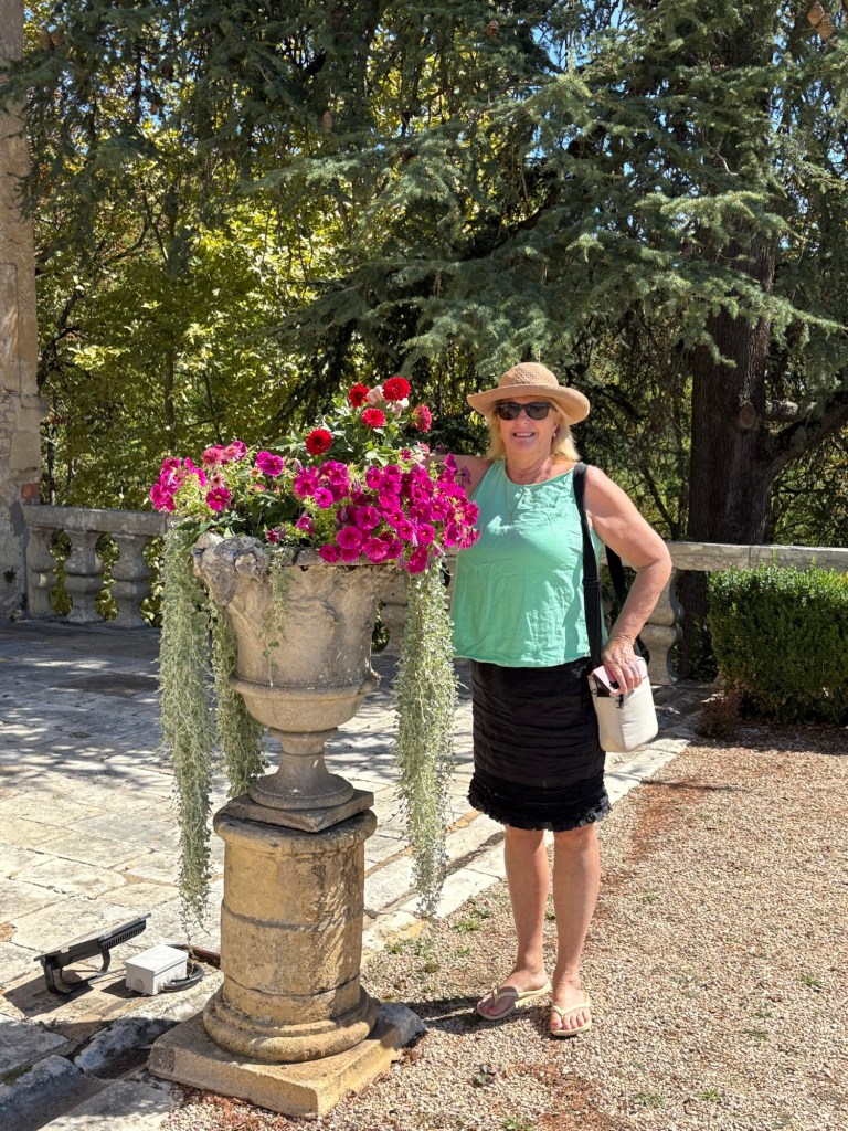 Meanwhile, Carolyn is enjoying the artistic floral planters full of dahlias and petunias! …. And blending somewhat more into the greenery and environment!