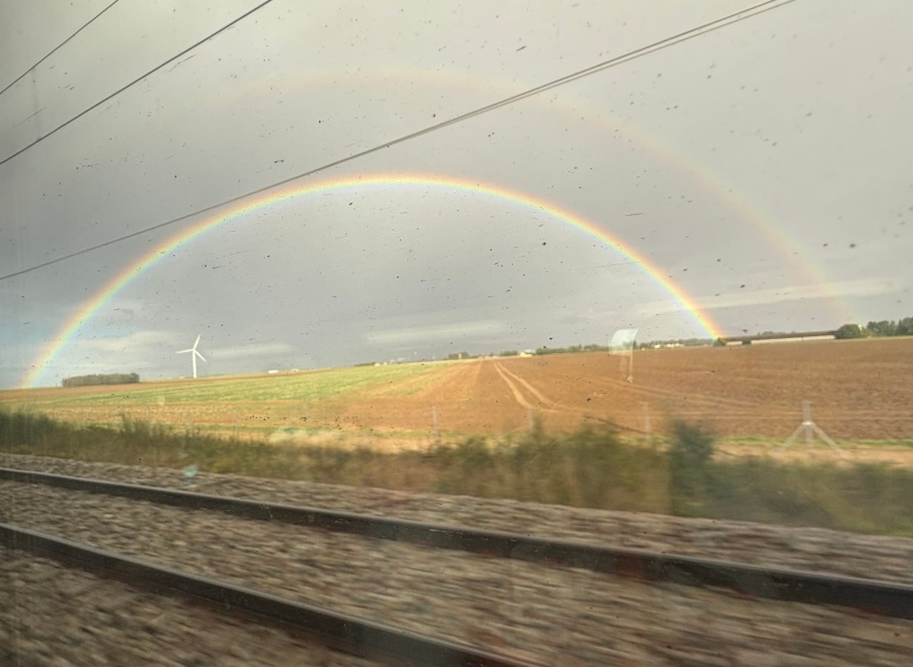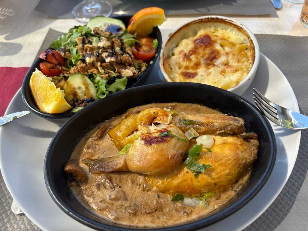 Here there was a set lunch menu…as with a lot of French lunchtime options…mushroom soup, followed by a charcuterie plate, main course of a stuffed tomato, and dessert! All devoured within a very short period….the sun had come out…