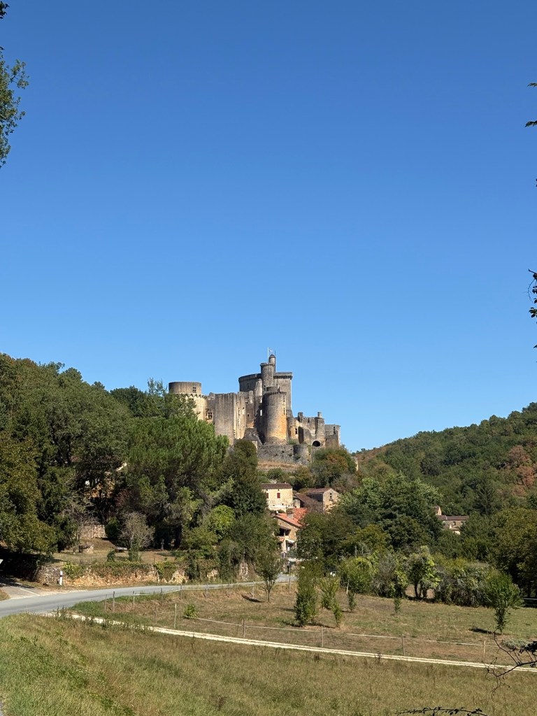 Waking up this morning to another glorious summer day (cool morning) , breakfast done, washing done, Rols off to work and the terrific three went to Le Clerc (supermarket extraordinaire)….stocking up on wine, beer, nibbles and pastry treats….yes several options! Kevin then dropped Carolyn and I to the Fumel Castle….for Carolyn’s first real view of the village and the lot river…
