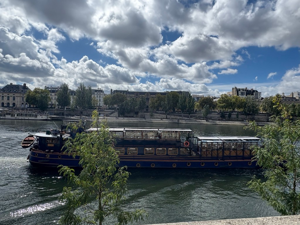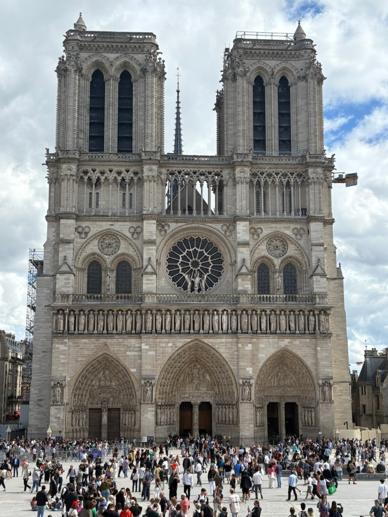 This Gothic style Roman Catholic Church, sits on the end of the Ile de la Cite (an island in the middle of the Seine river) Its construction began in 1163, completed in 1260….and through the centuries was modified and maintained until a fire in 2019 severely damaged it and forced its closure (for extensive repairs) until December last year….consequently a very popular tourist attraction now it has reopened, with crowds of humans queuing for hours to get inside….these two humans were happy to view from the outside as the afternoon was waning, we were still dry despite the threatening black clouds….and we still had one more crucial site to visit!….