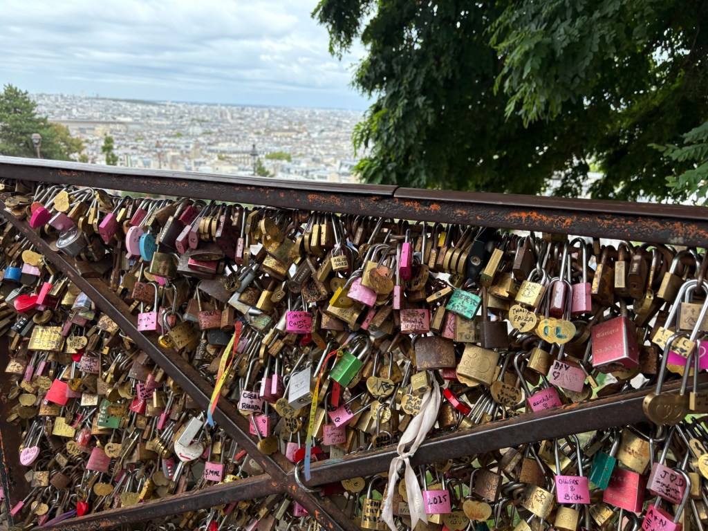 The romantic notion of padlocks has migrated(from the Seine river bridges) to the fences bordering the plaza surrounding the church!