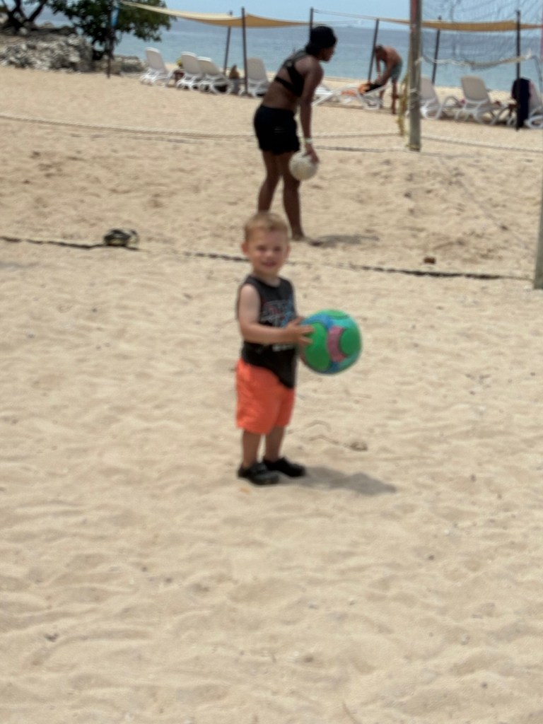 Upon hitting the sandy atoll, Henry made a beeline for the first ball he could see! While we were introduced to the afternoons, bbq plan, and activities available…we all enjoyed a great BBQ with lots of salad! And the complimentary beer and wine started flowing! However for yours truly….there was not a lot of time to sit and relax…