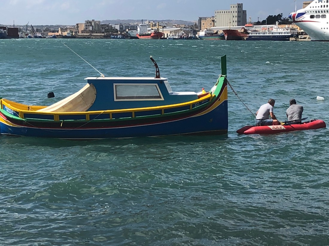 A couple of locals trying to secure their Luzzu on its moorings – and this was on the sheltered side!