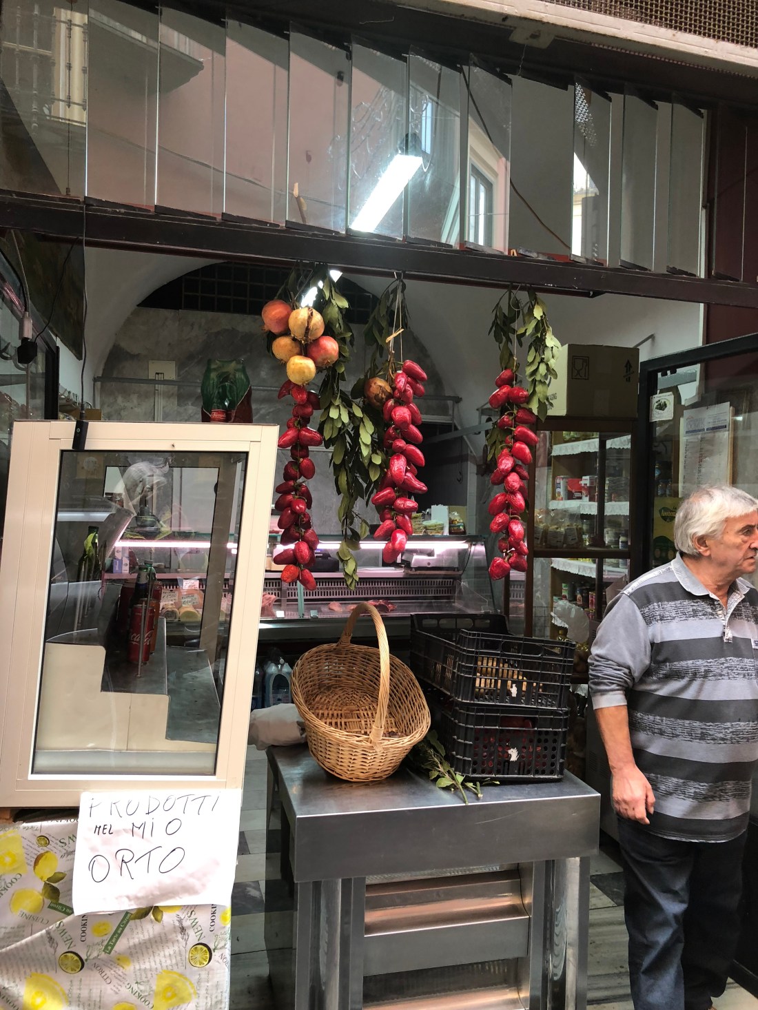 A little butchery and fruit and vegetable seller (strings of rather old peppers)
