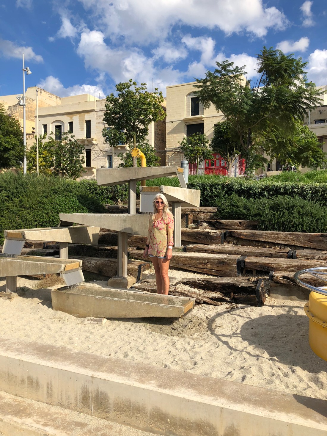 Sue back in shorts again and the water feature trickling away.