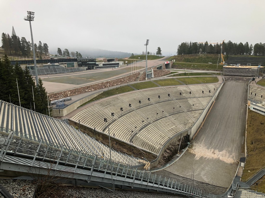 Looking down into the jump runoff and stadium seats – in the distance you can see cross country dry training (with a form of long rollerblades)