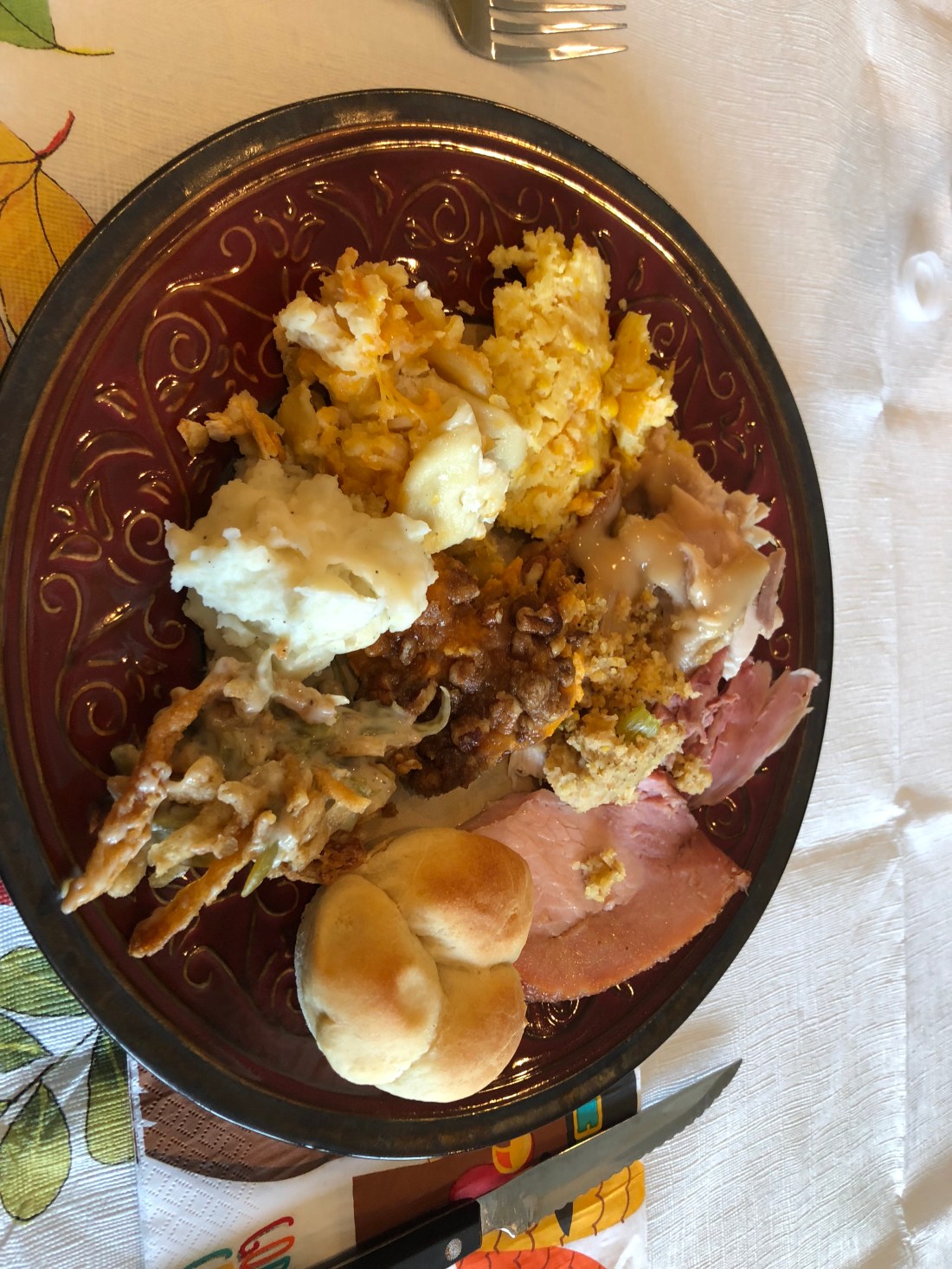 A plate of turkey, ham, sweet potato, Mac and cheese, green bean pie, corn pie and a number of other dishes I couldn’t fit on my plate!