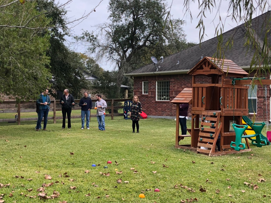Here its Bocce (or as we know it pétanque) The adults circumnavigating the backyard and the kids playing on the playground!