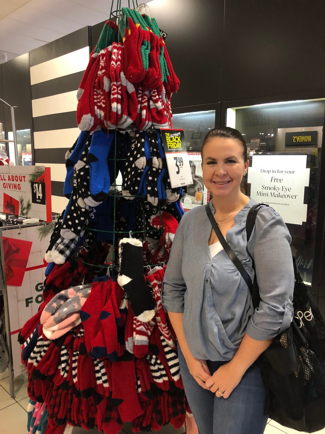 Kelly with a Christmas tree of socks, hats and scarfs.