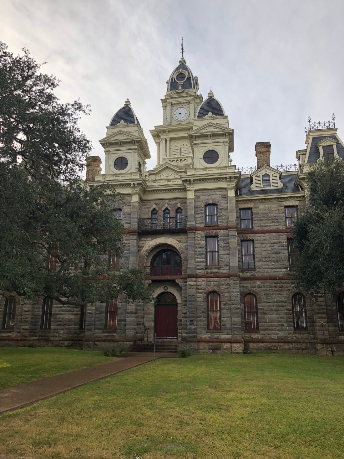 The county courthouse in the middle of the Goliad town square.