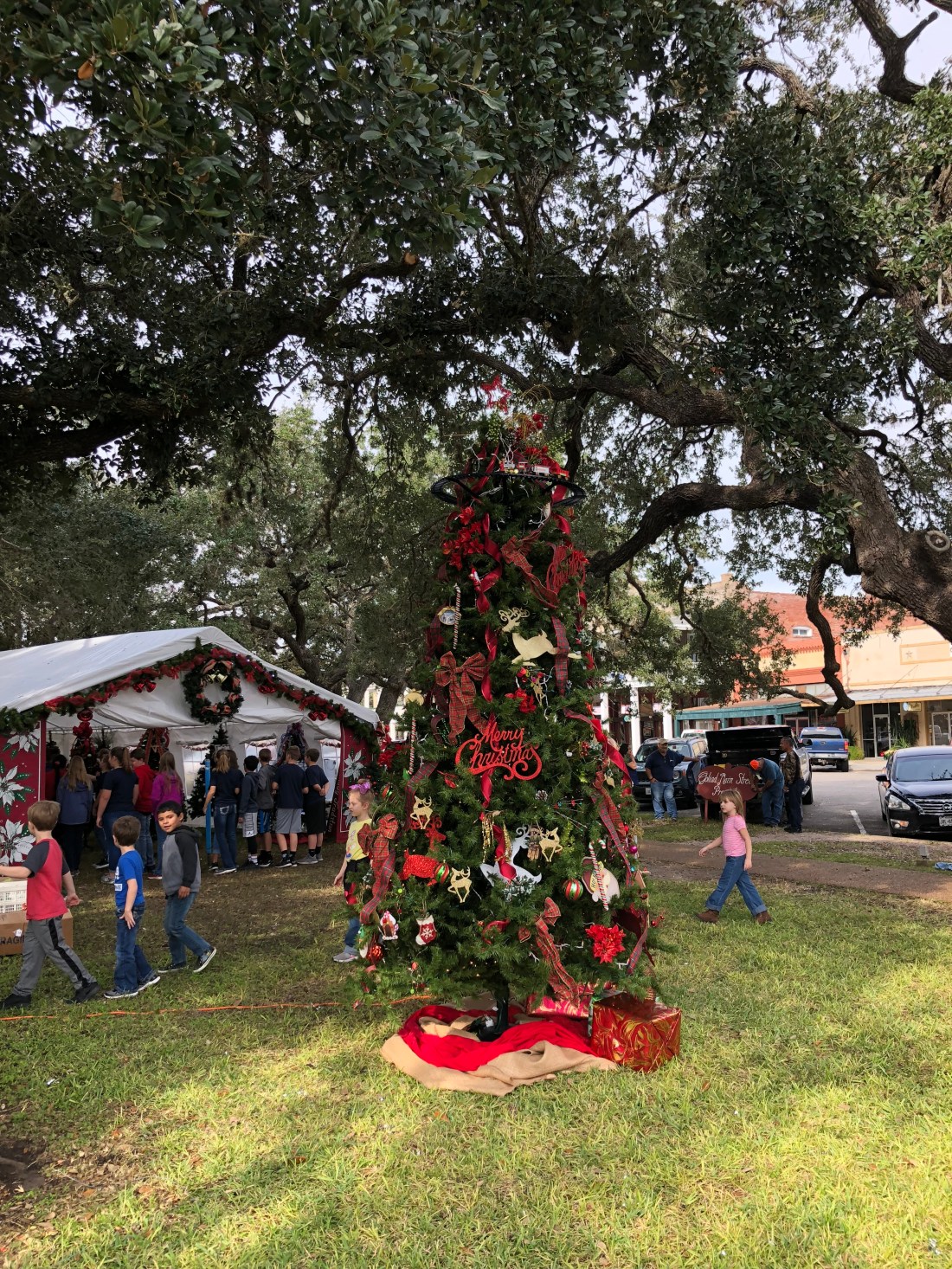 This is Keli’s Christmas tree decorating project, where all the town groups and school classes come in to decorate a tree, and then these are donated to families in December!