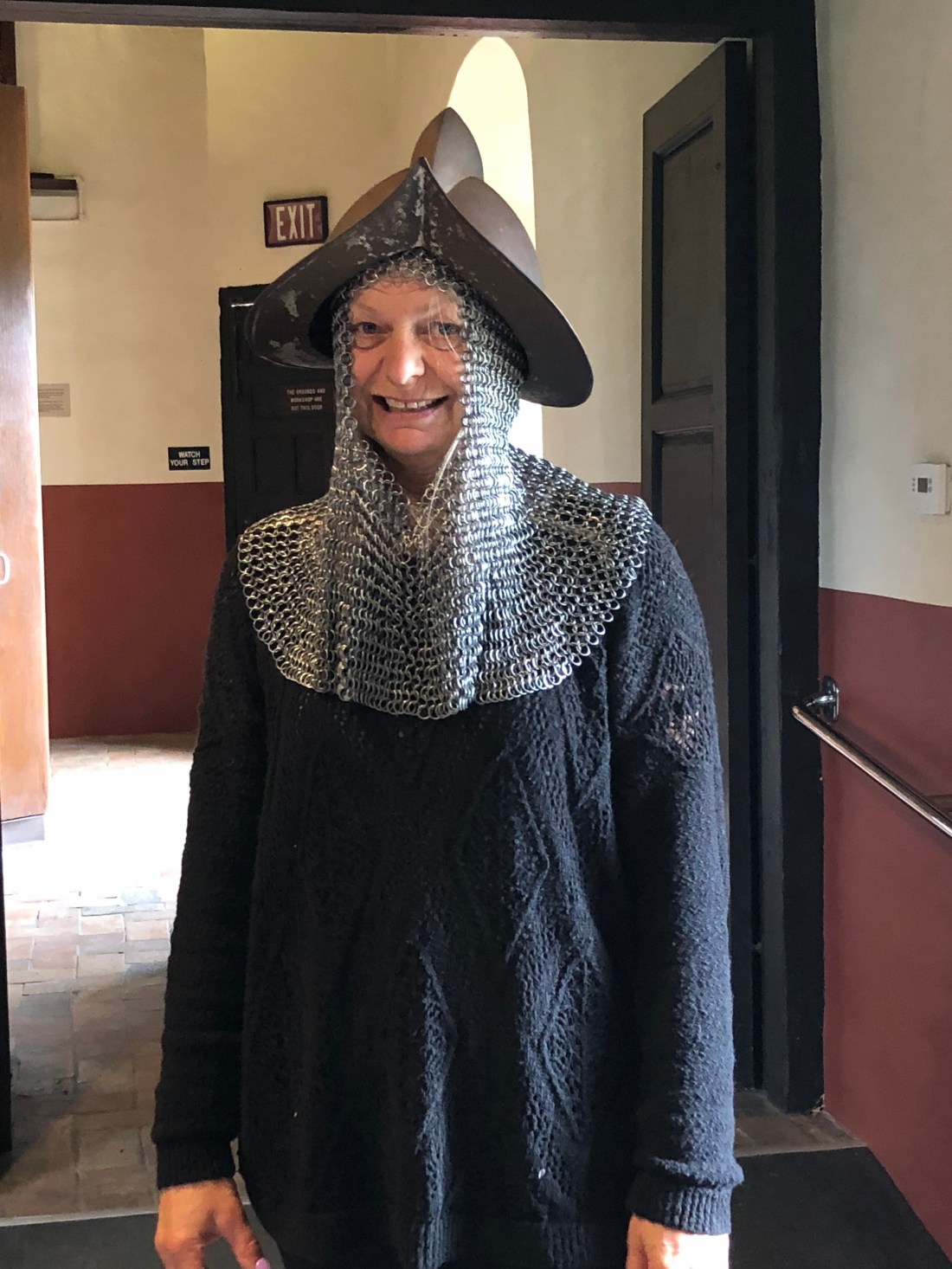Trying the traditional headwear on for size – the metal balaclava making my neck shorter by the minute (extremely heavy).