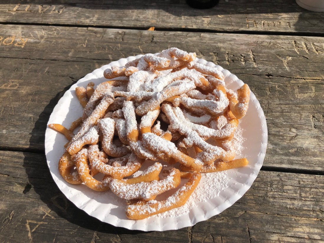 Funnel cake! Like crunchy donut strips – great diet food but goes well with a beer and country music.