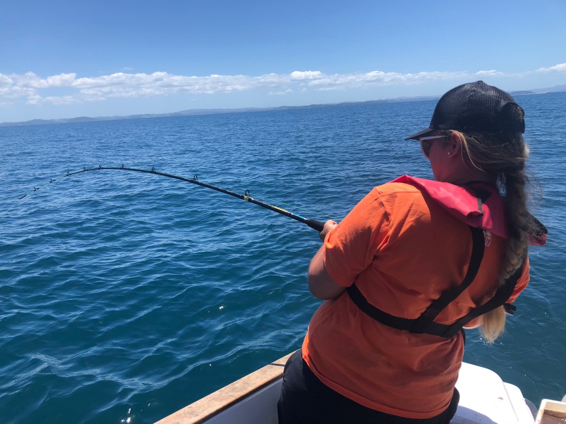 By 2pm we had run out of bait (thanks to Sue) and Steph had one last piece on her rod (while I was tidying up ready to up anchor and head back in). She got a kingfish strike and it was a big one as it roared off with her line!