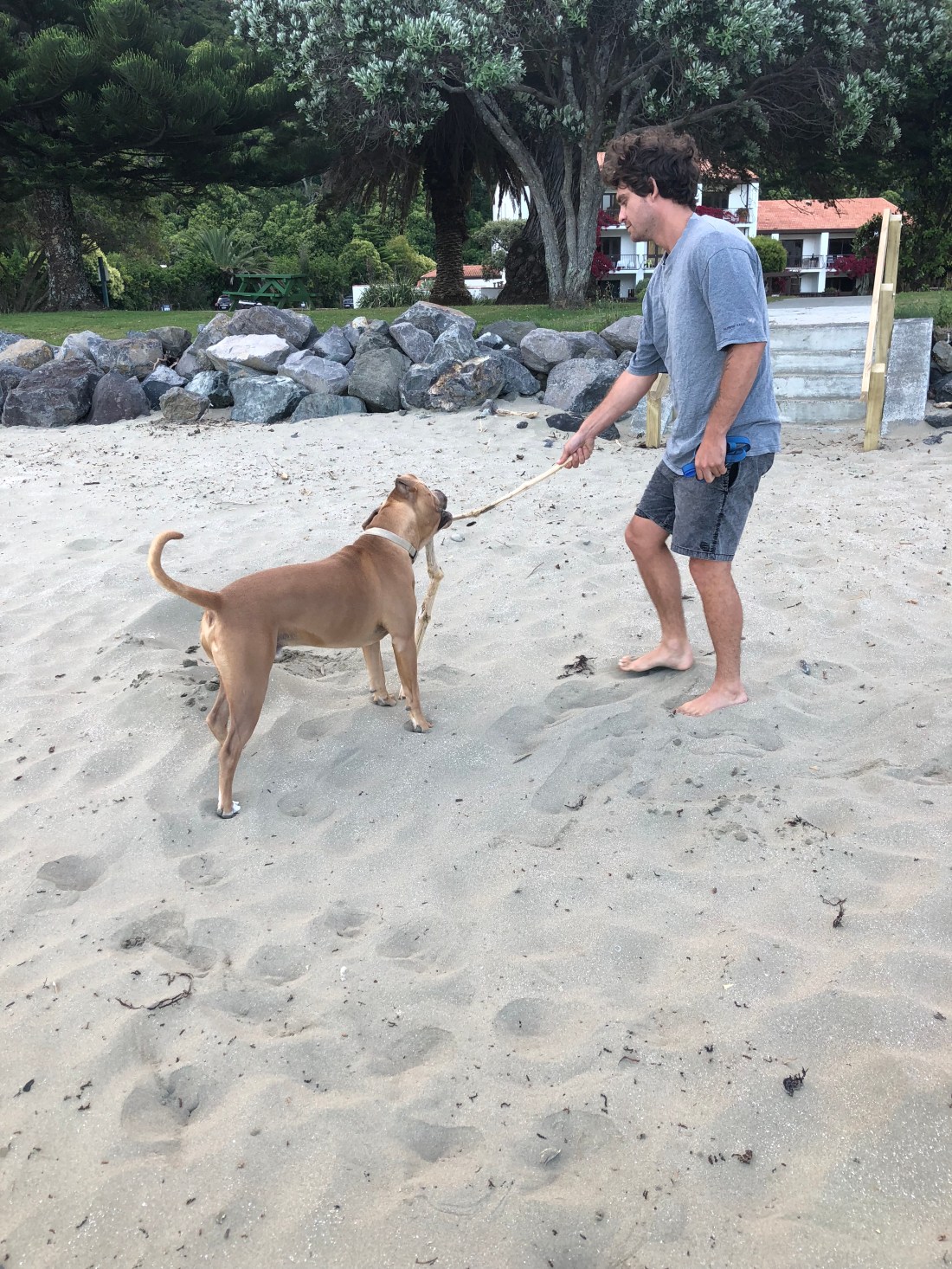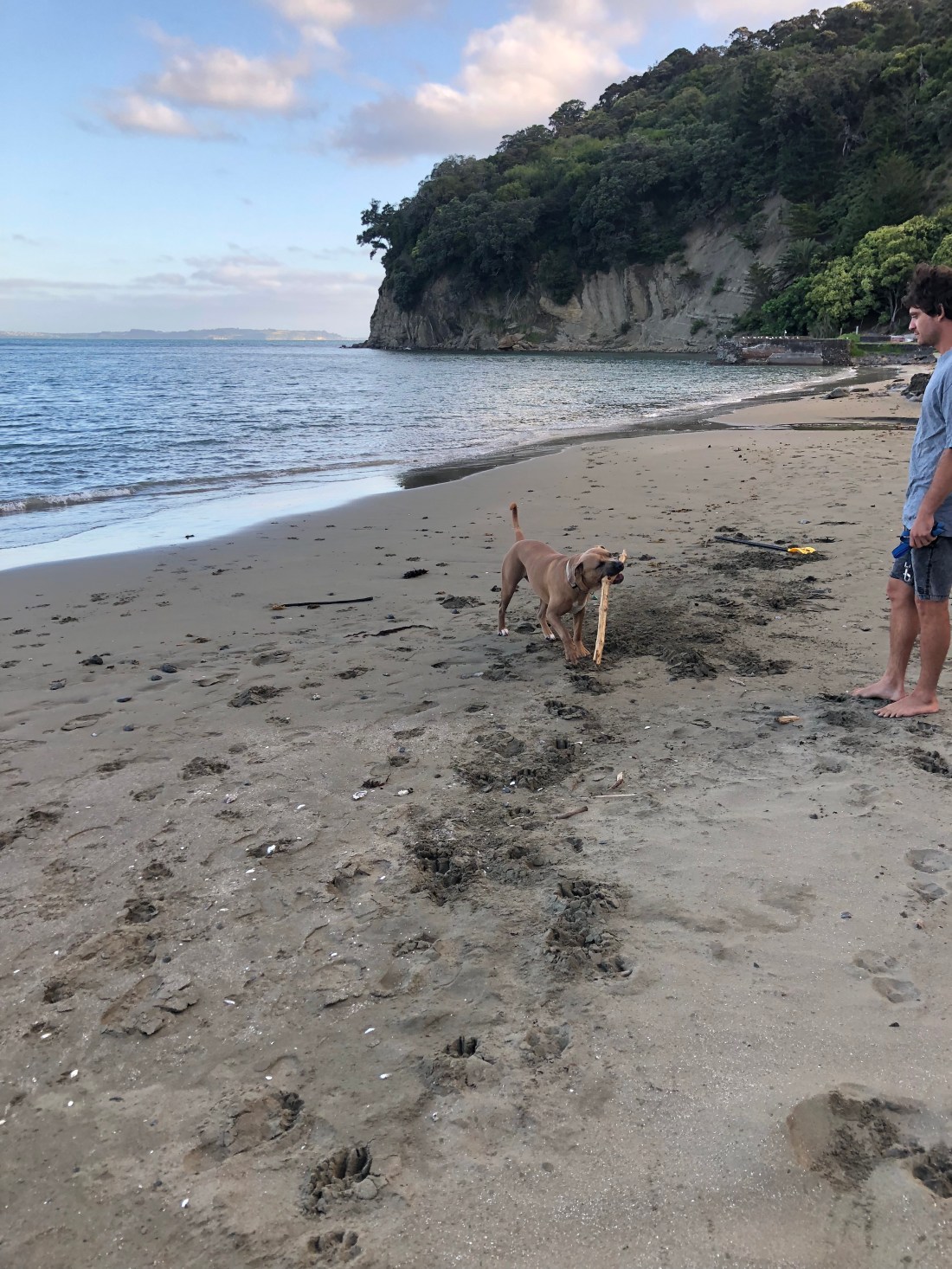 After a cleanup day yesterday and then today, a day of Jaxon cooking Slow cook BBQ brisket (Texas style) on his new toy (Webber burner), culminating in a delicious meal (It was a long day for the chef who started his cooking process at 4am this morning), we took an evening stroll on the beach with Floyd (Dans dog).