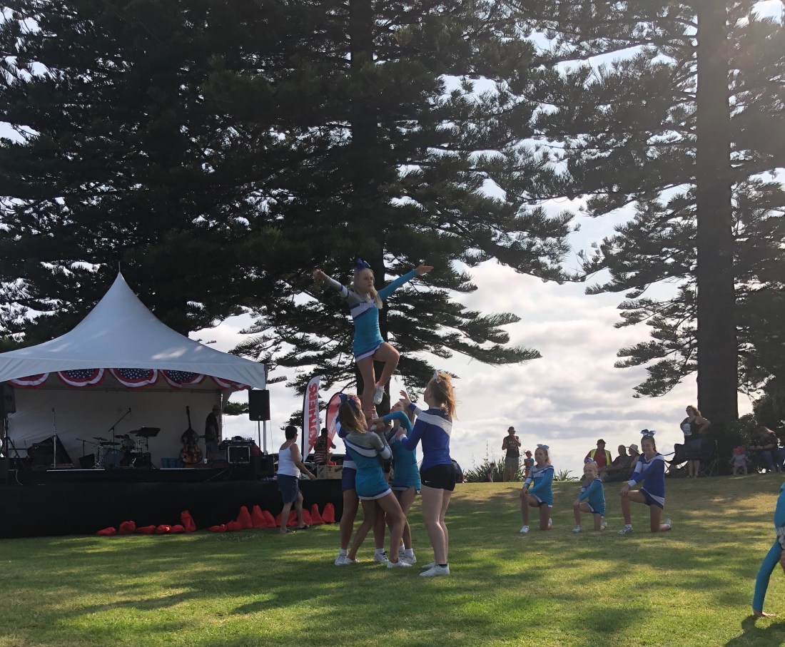A kiwi cheerleading squad performing in front of the stage – right on the waters edge.