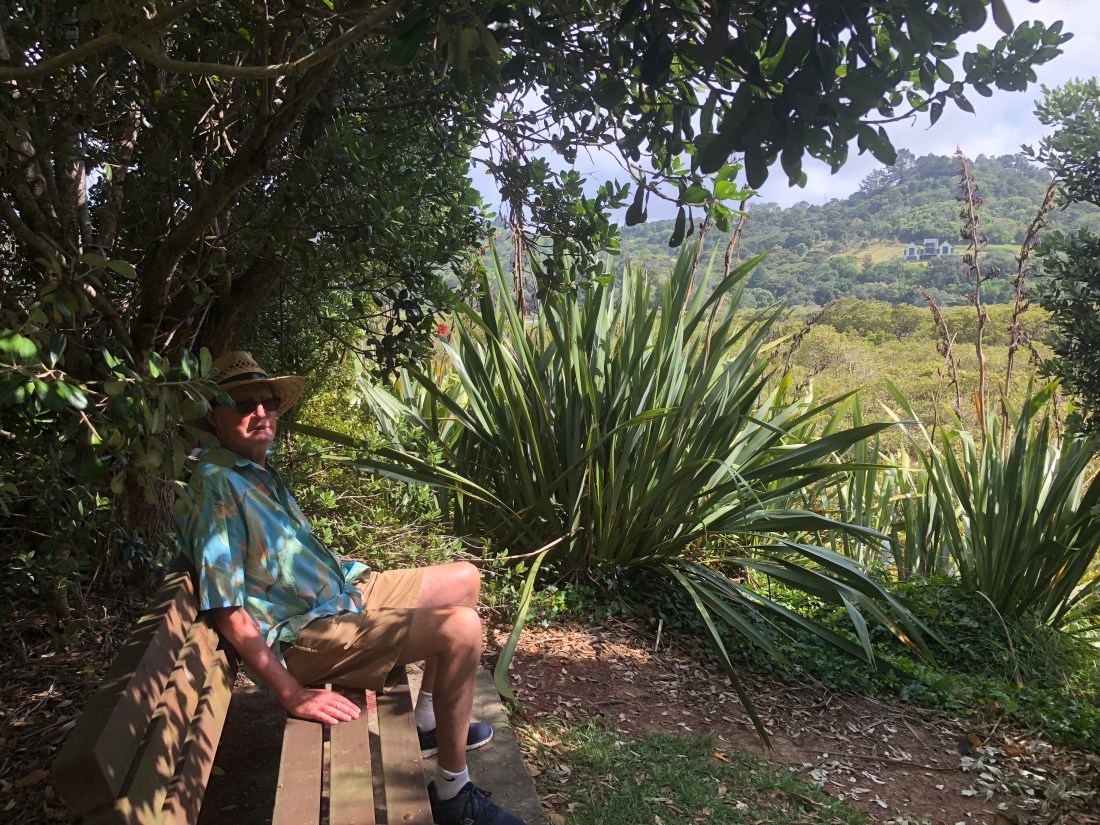 Russ having a rest overlooking the estuary, surrounded by New Zealand greenery.