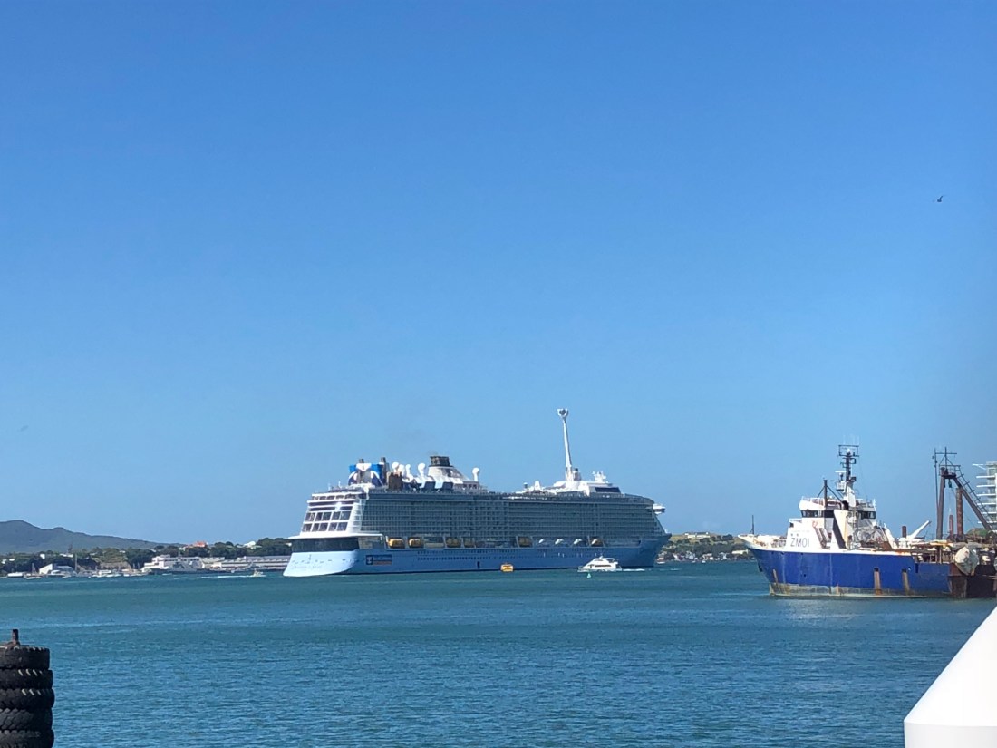 A cruise ship so large it couldn’t dock in Auckland and Lissa and Johnny were tendered to the shore, having to fill in time as we encountered the Monday morning traffic jams heading in from the Hibiscus Coast!
