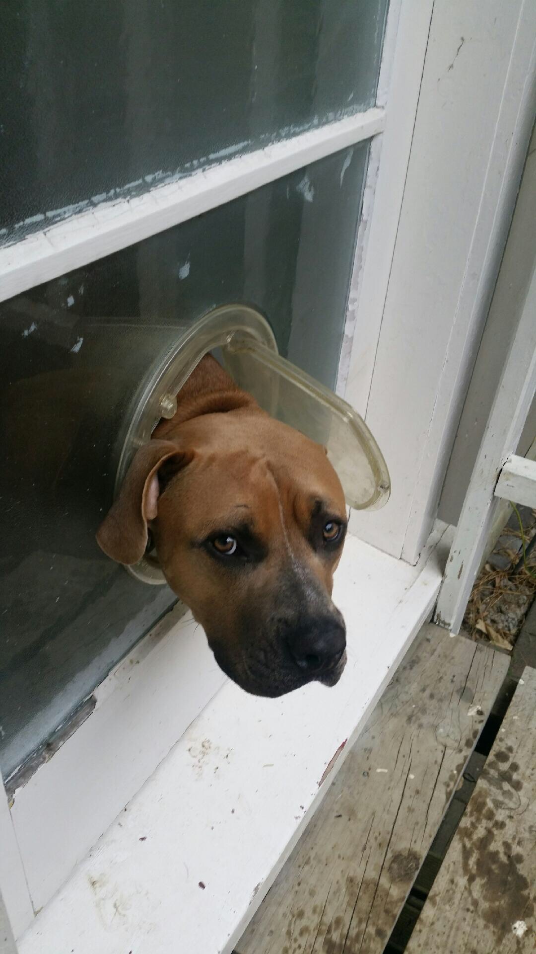 The grand baby shut inside on stormy days and not too happy about it – cat door has its uses!