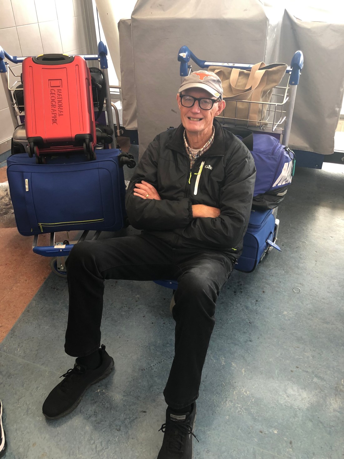 Qatar was not quite ready to take us – so Russ found a spot to sit and guard the bags!