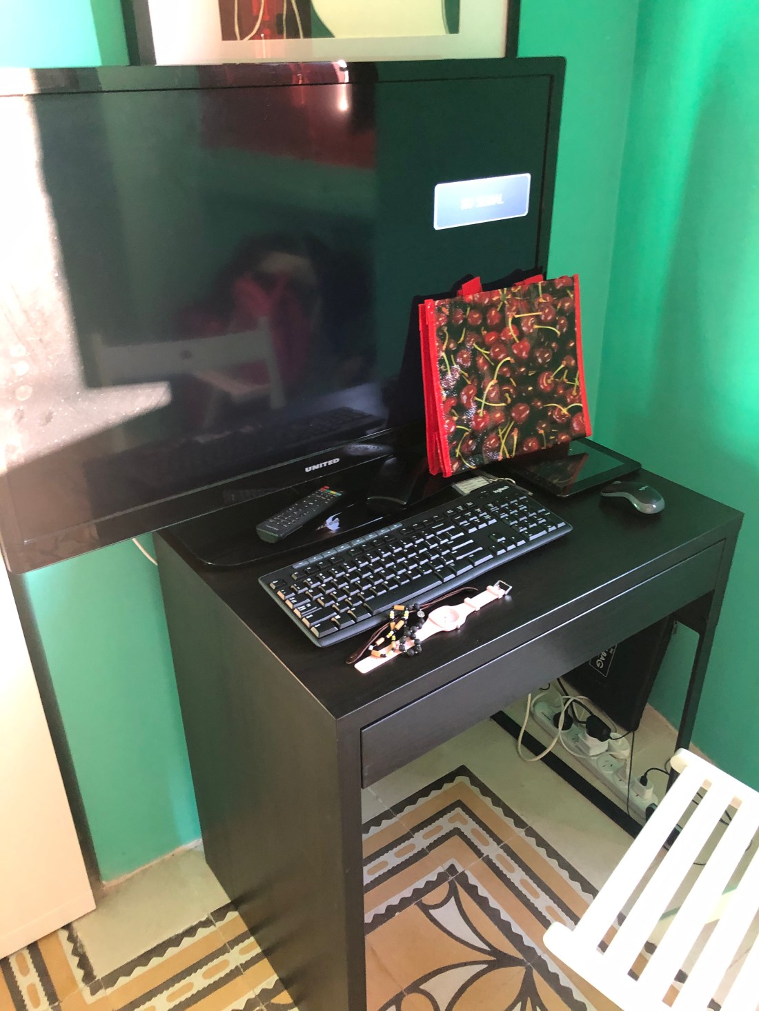 A couple of hours work – workspace all set up! – clearing emails from the last 24 hours and The Cherry bag embarking on its international adventures!