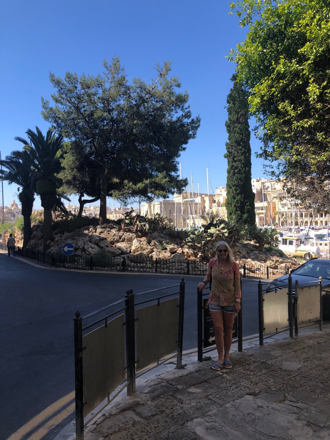 Sue in Birgu, framed by the spring greenery, while waiting for our visitors to arrive on the ferry.