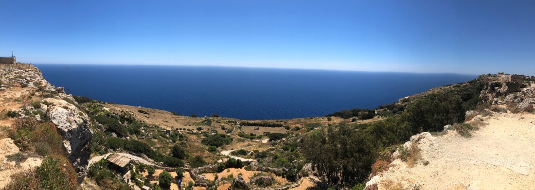 A panorama of the deep blue sea and farmland at the base of the cliffs. A bluebird sky and views of an untouched world, a far cry from the populated east coast of Valletta and north and south of the capital.