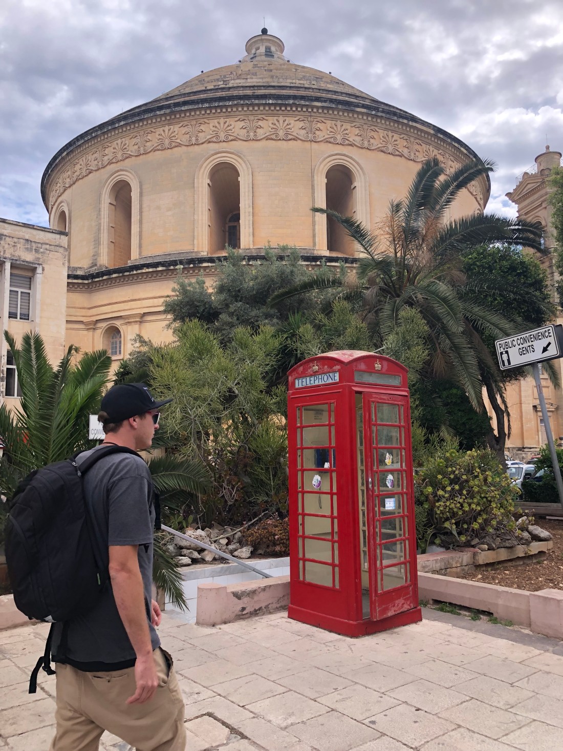 Aaron photobombing my picture of the phone booth with the church dome in the background.