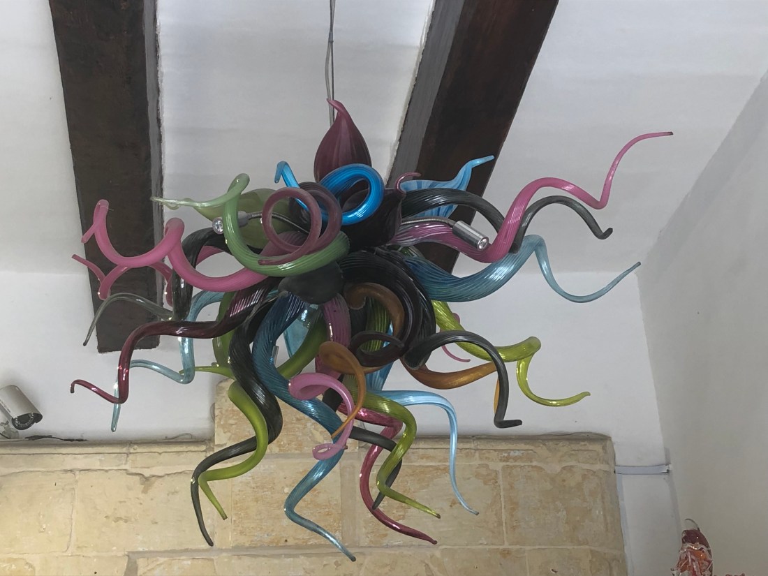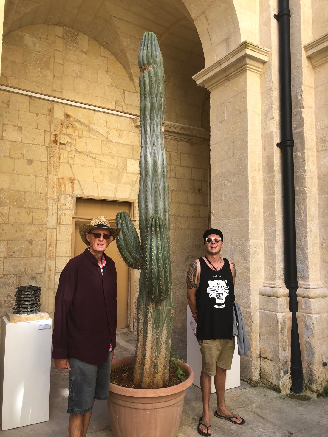 A very tall cactus dwarfing our six foot plus boys in the courtyard art gallery.