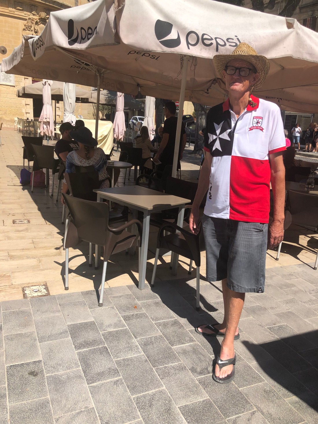Russ sporting his new 2 euro purchase from the op shop – the Maltese rugby jersey.