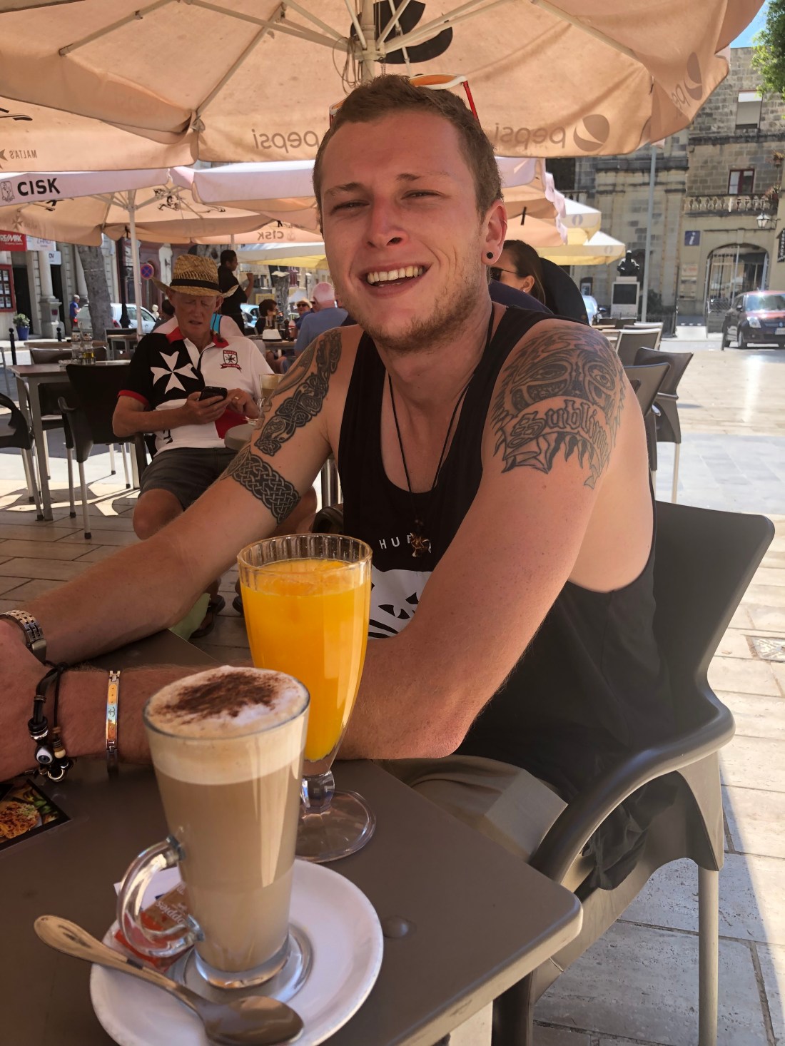 A happy Aaron finally found a freshly squeezed orange juice.