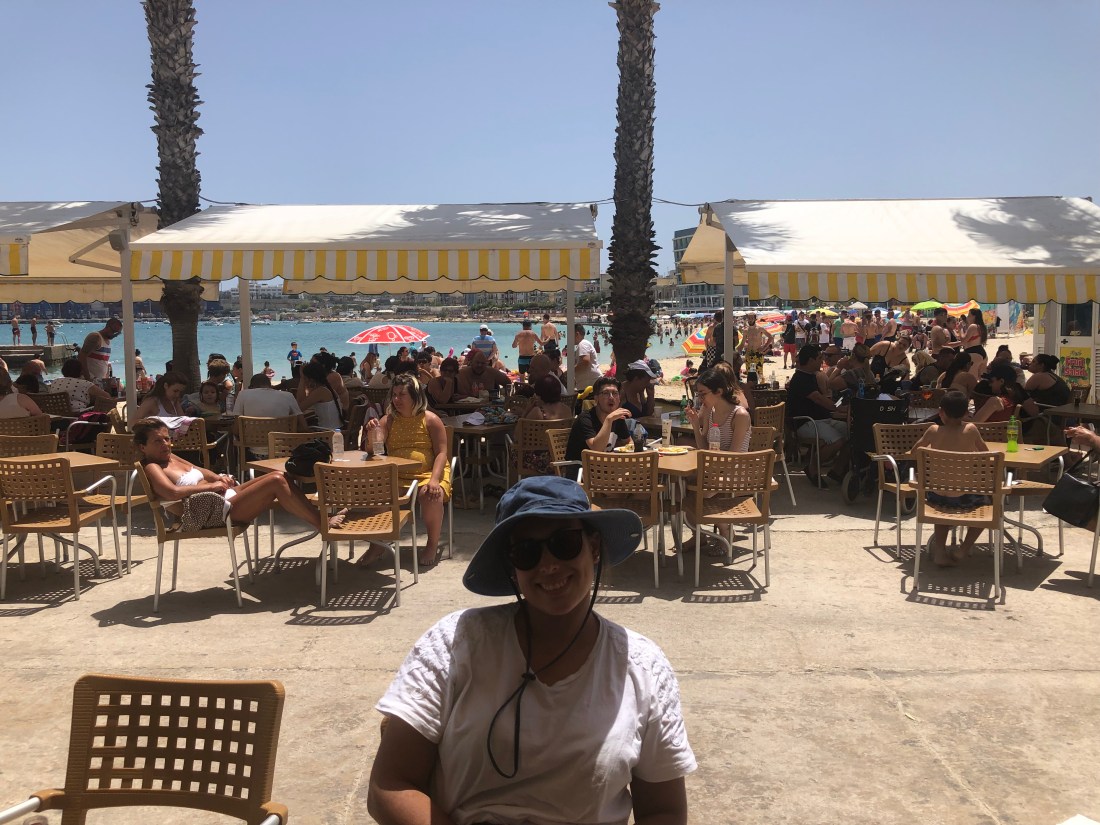 Steph relaxing before we hit the crowds on the beach (in the background), for our afternoon dip.