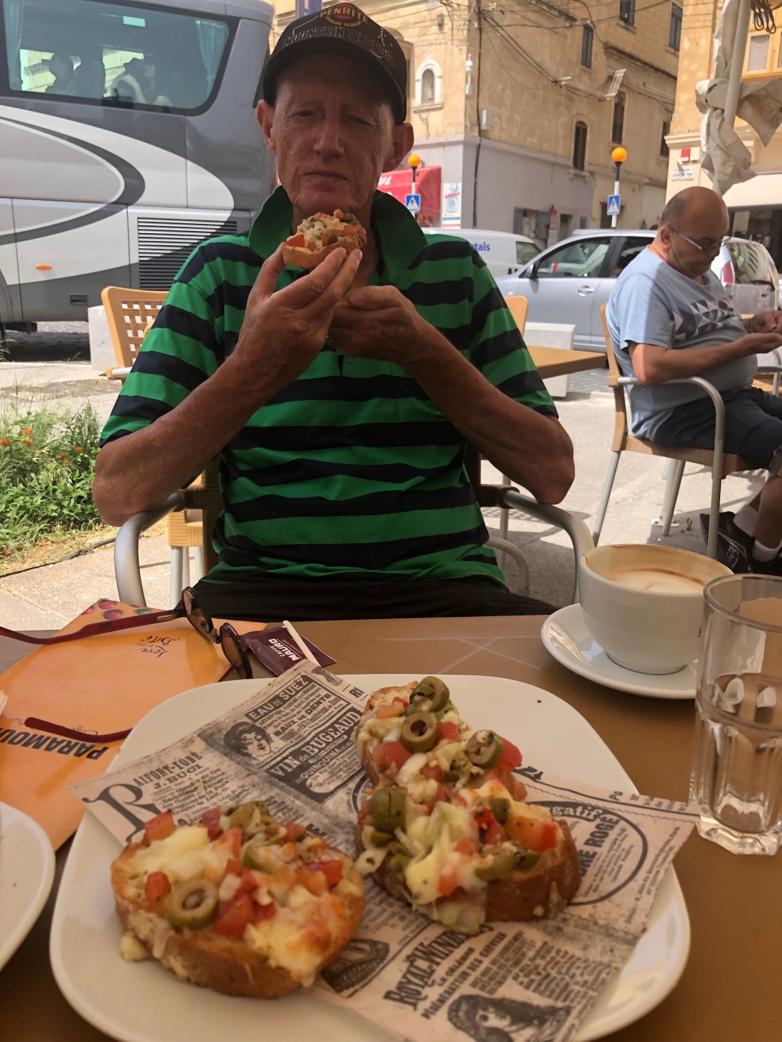 Russ enjoying a second breakfast of bruschetta – a deal for 2.5 euro! (About $4.00 NZ)