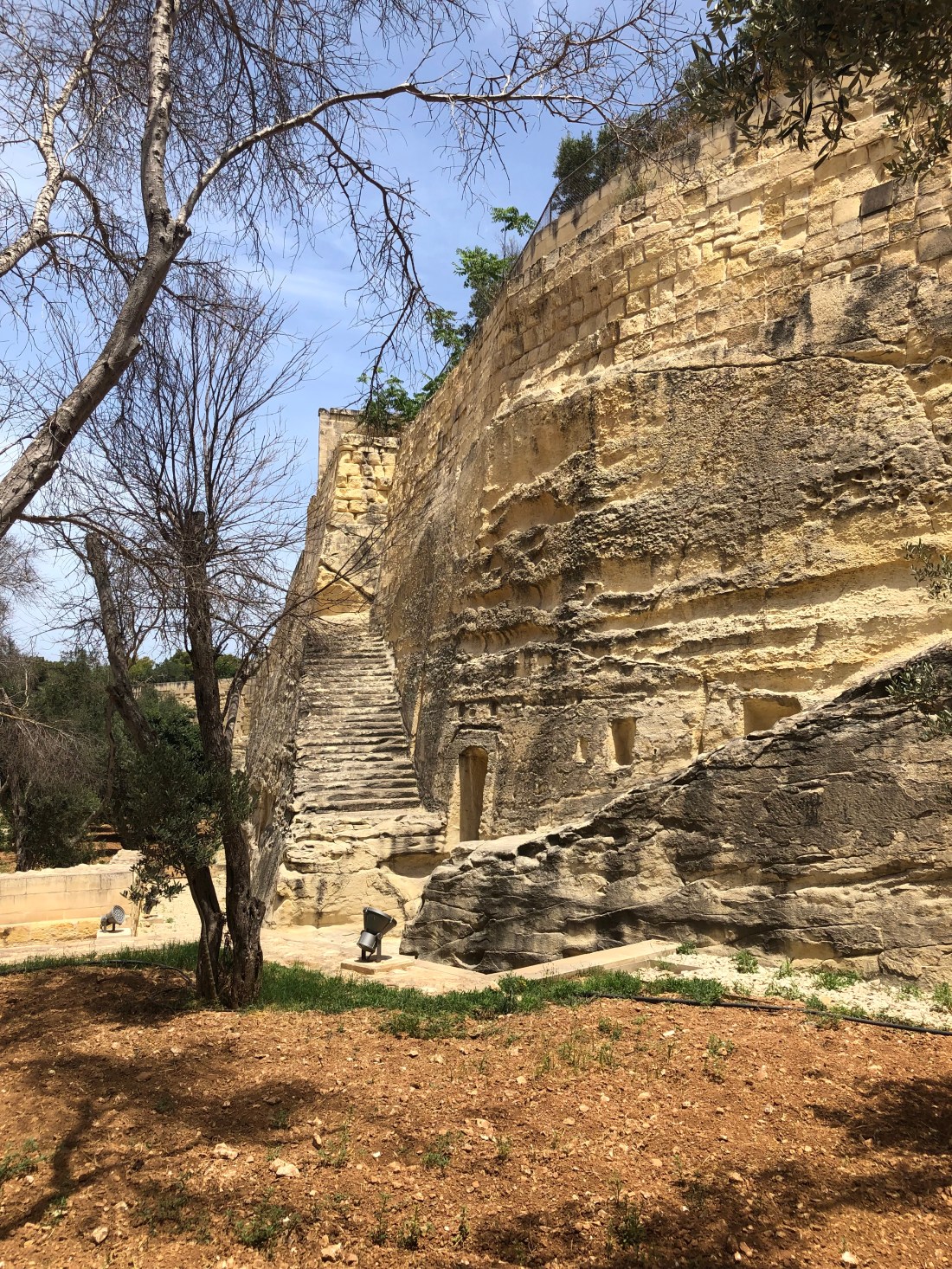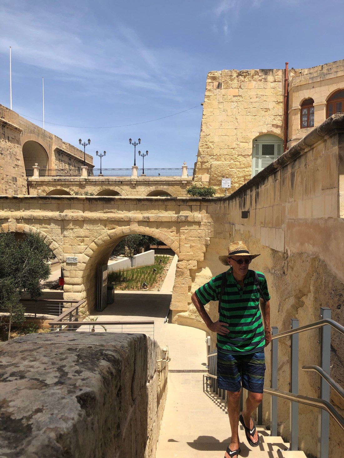 Walking in the restored gardens between the two towering walls. The original wall of old Birgu and the fortifications of the 2nd wall built in the 1600s (the era of the knights).
