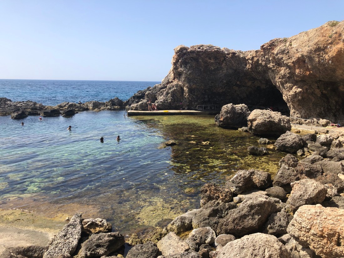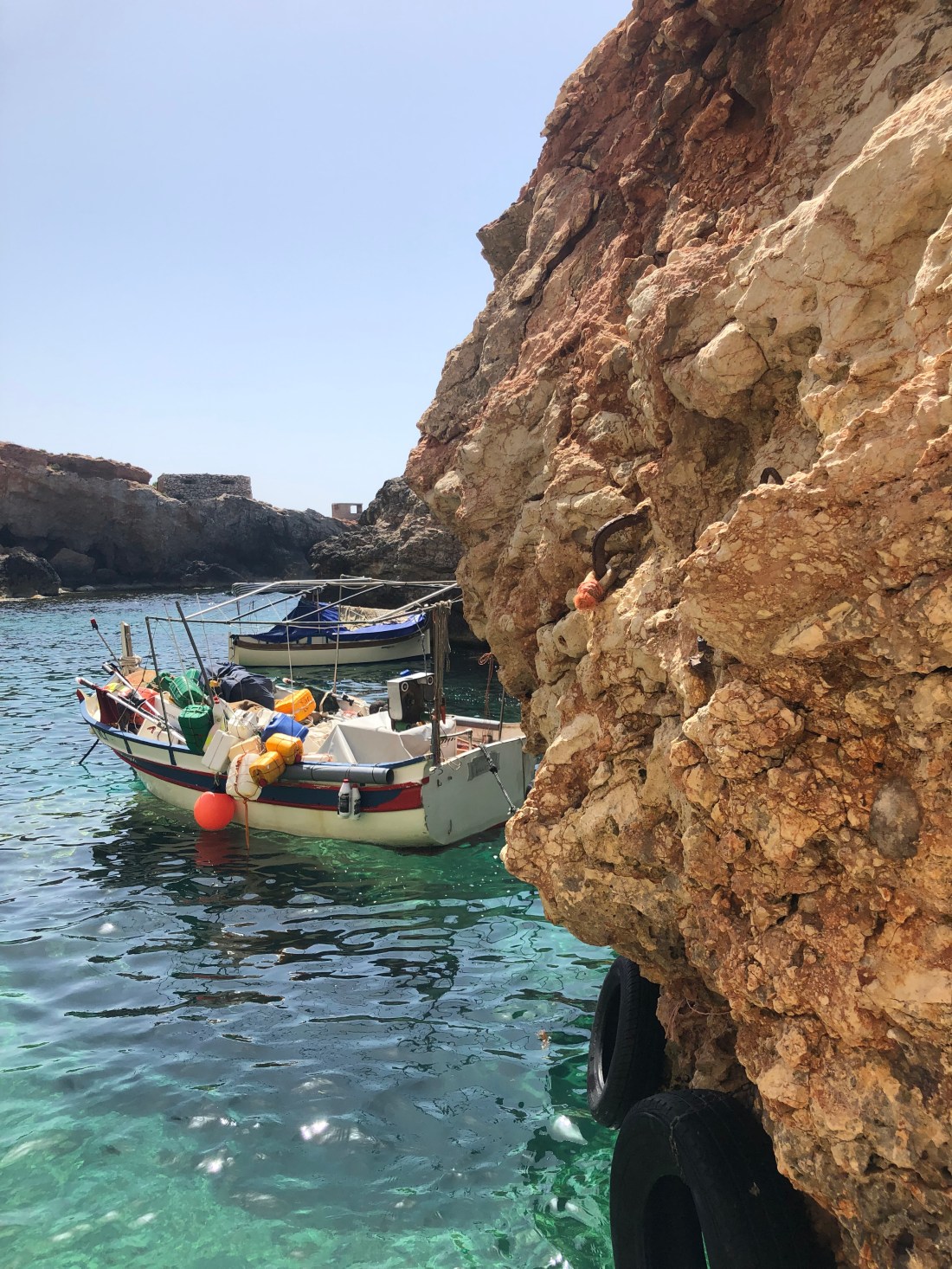Maltese Luzzu (fishing boats) moored next to the rocks.