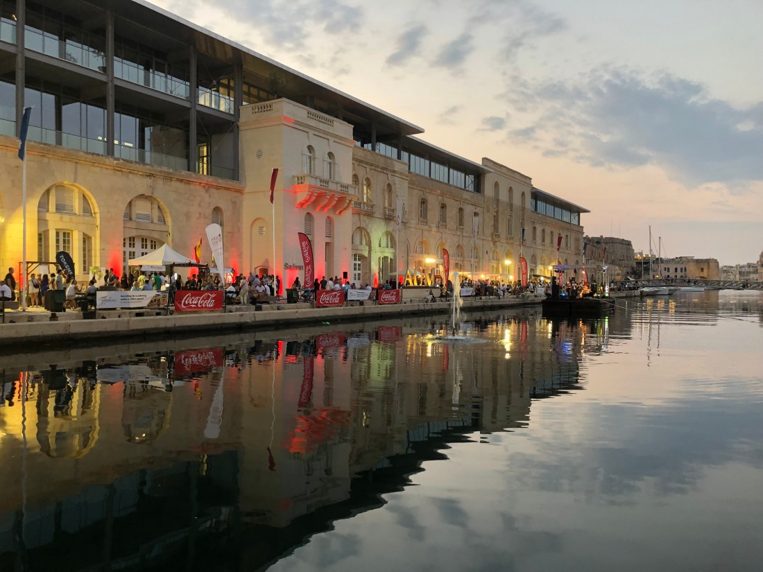 Our table with a view down the Bormla inlet, glowing in the evening lights.