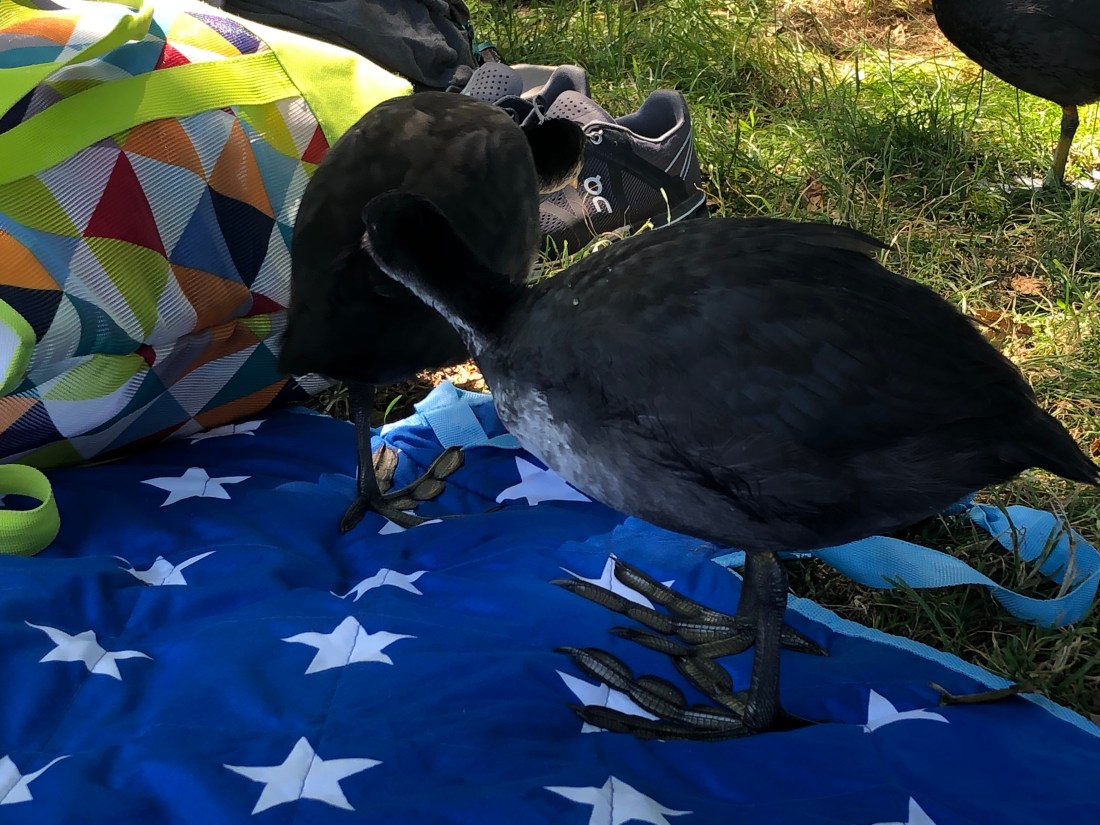Sue amused herself watching the confident ducks(?) make themselves at home on our blanket. These guys have the biggest feet I have ever seen on a bird, it looks like they are wearing flippers.