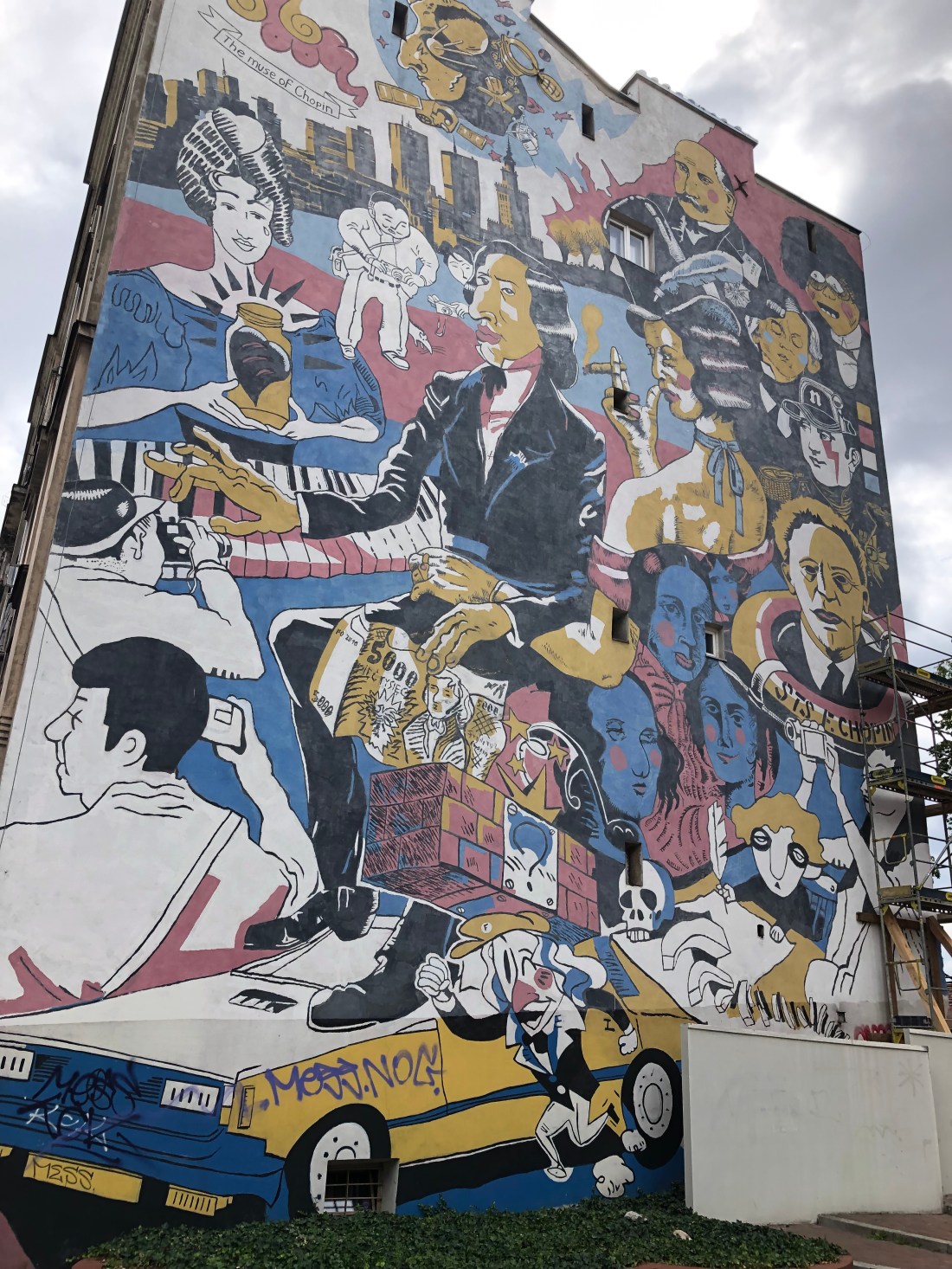 A wall of street art, in fact there does appear to be a lot of street art, and graffiti on the accessible walls…this however brightened up a dull morning (puffer jackets on again in our wawsaw summer break).