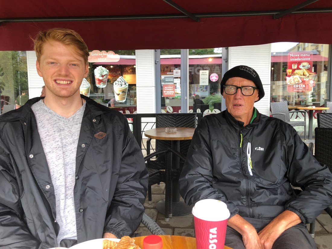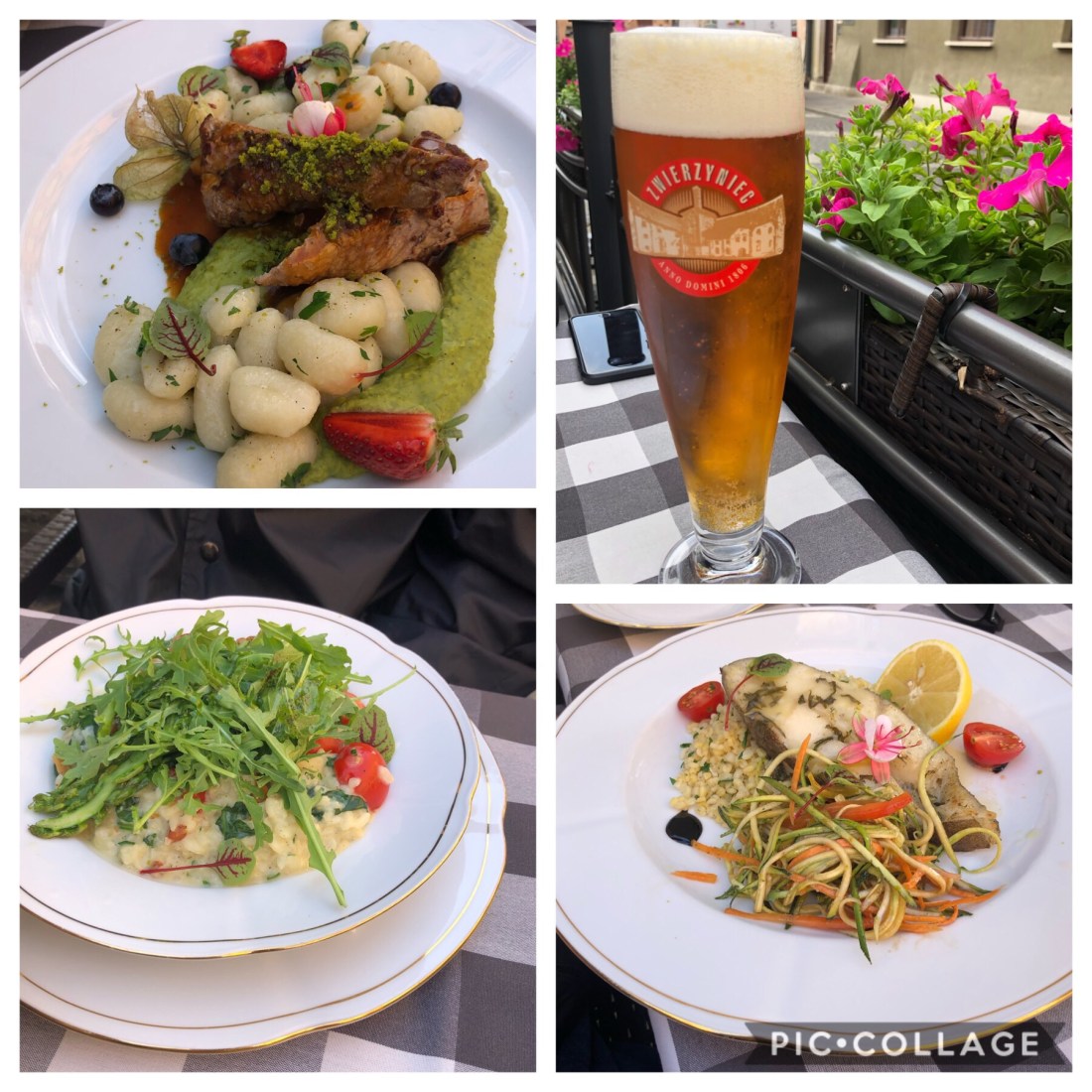 Zwierzyniec Beer, halibut, pork and peas, risotto! The ratings on the food were correct, delicious food. And just so we will write a good review on TripAdvisor, our waiter Simon bought out complementary flavoured vodka shots! Whilst we were eating our dinner a couple of accordion playing street vendors came past and George shared our bread with them.
