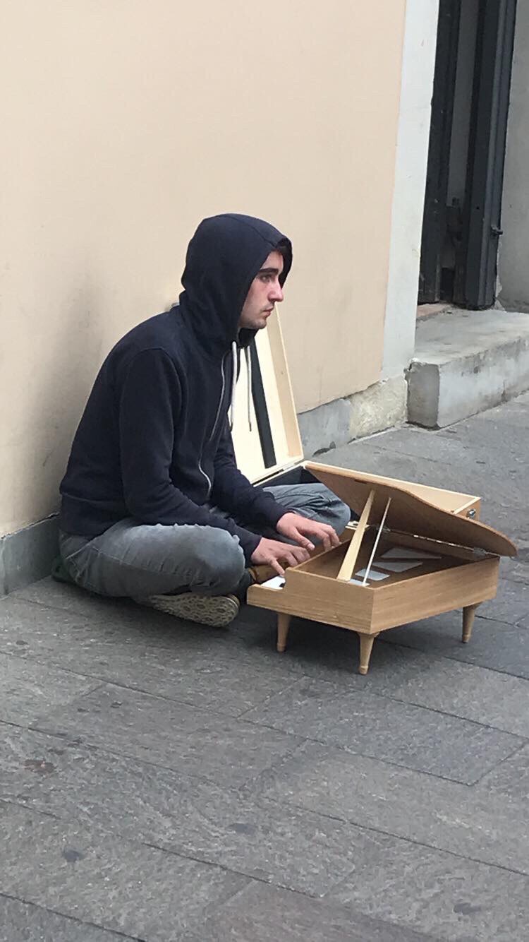This young man Playing his tiny piano and really enjoying his life…I think!