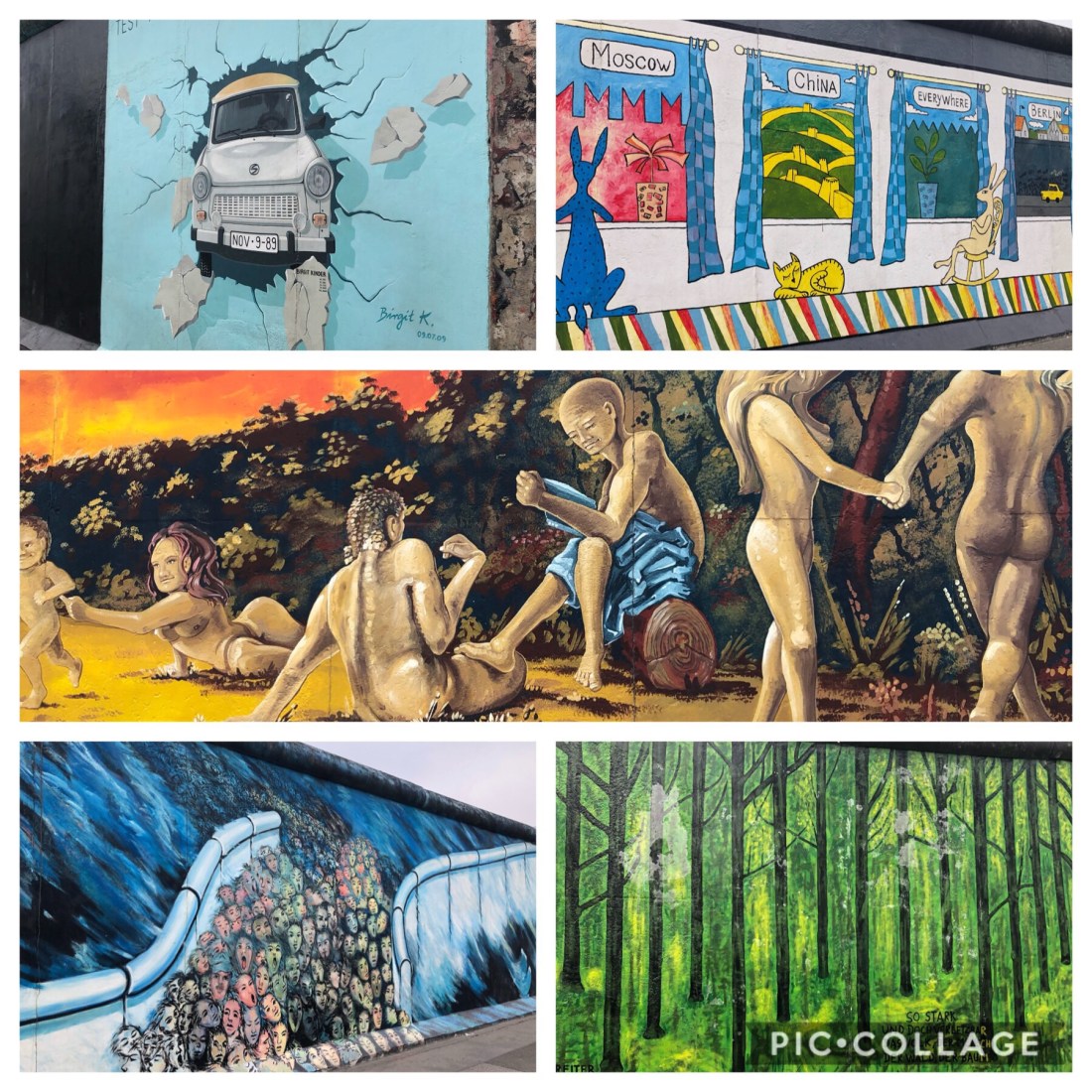 Images of the wall from both sides, one side with art, the other with graffiti art.