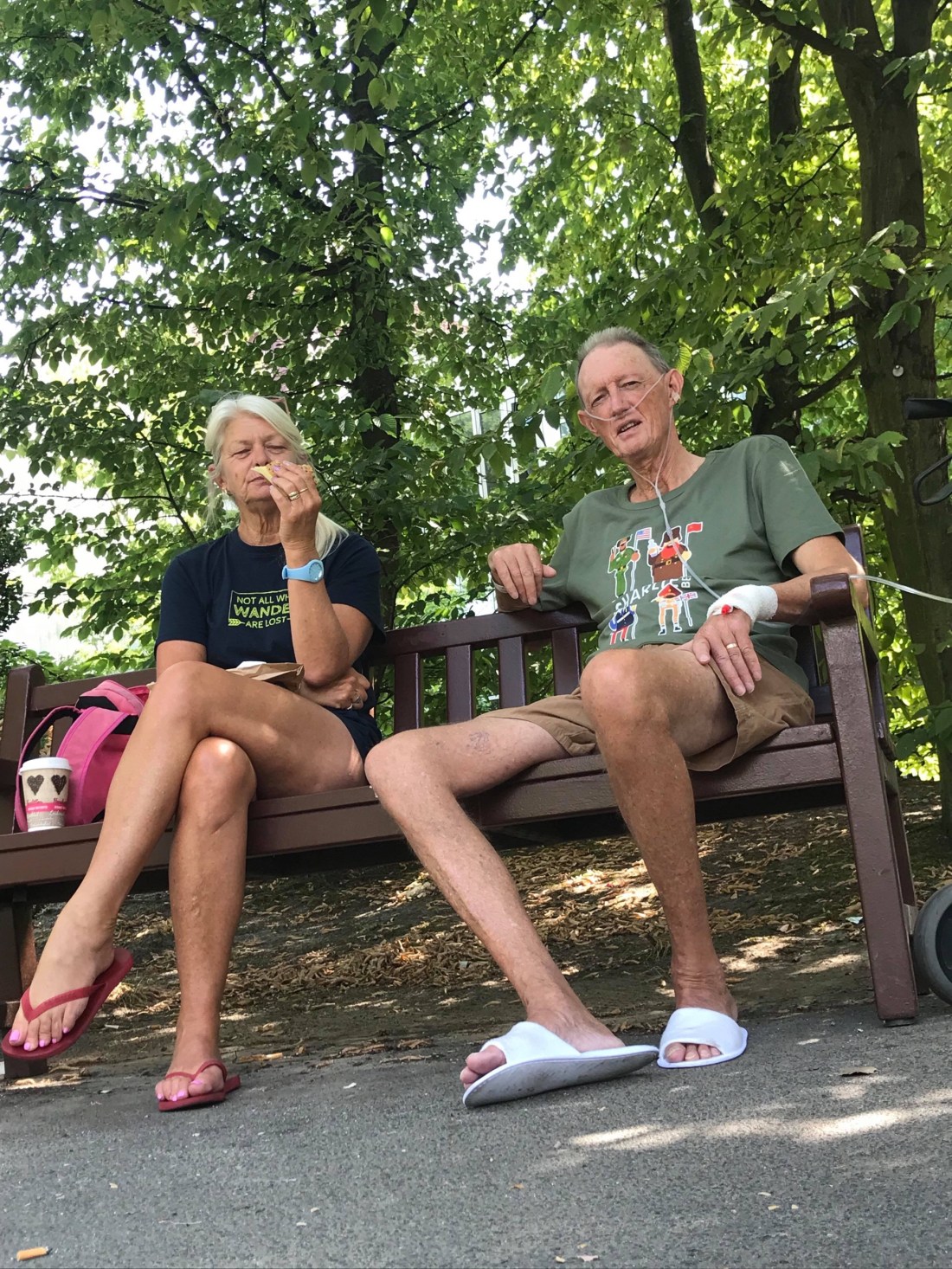 As in all hospitals in weekends it’s kinda lacking it’s usual business and as Russ is feeling better, with oxygen, we all took a walk outside and sat in the gardens.