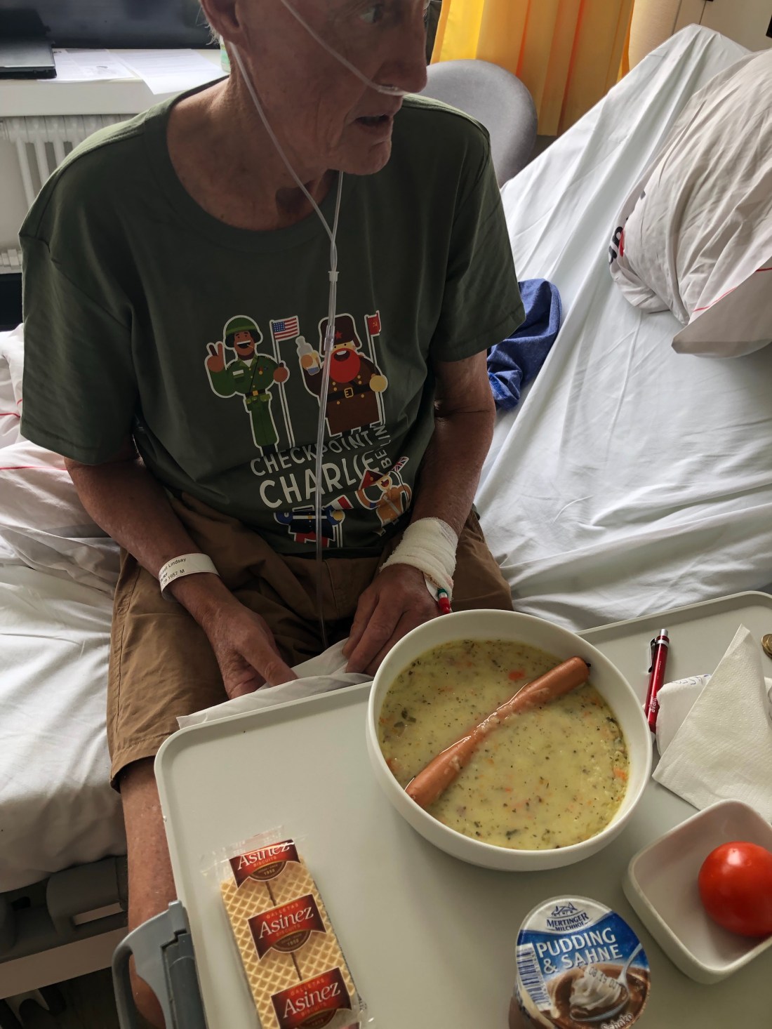 Russ’s lunch came – soup with a sausage! He said it was really nice.