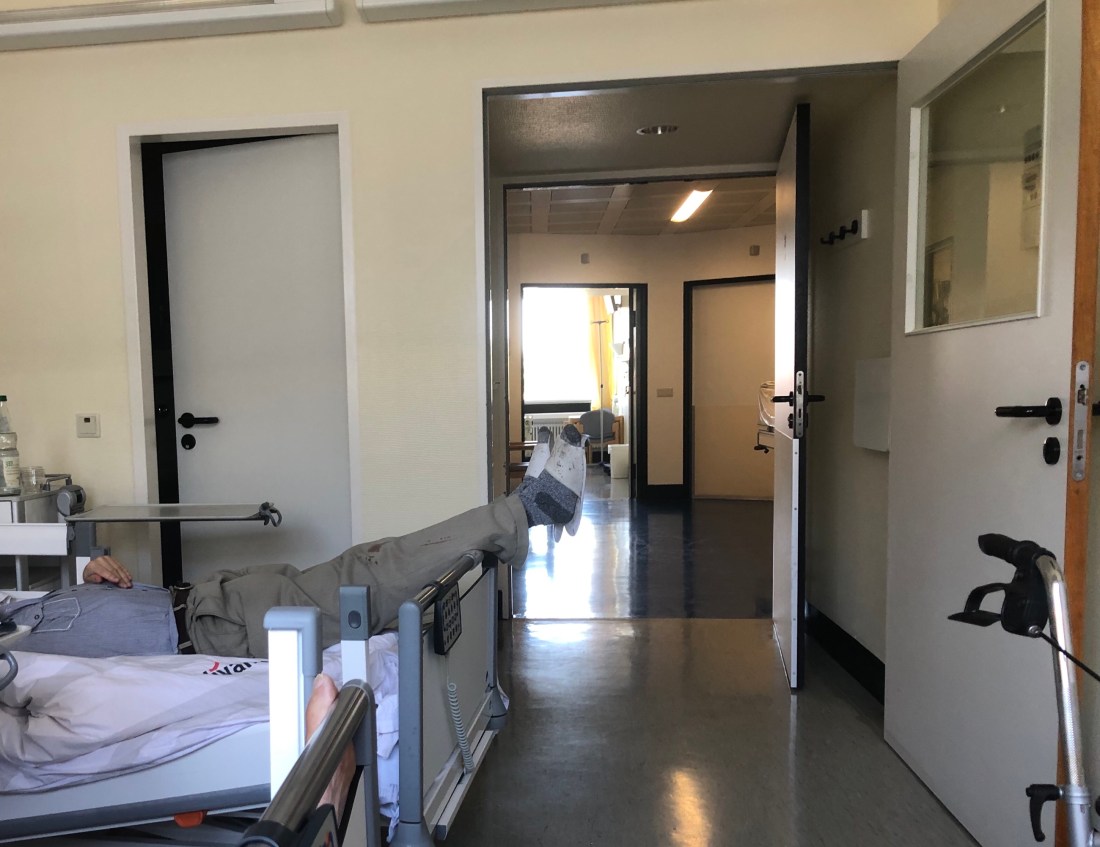 I arrived around 8.30, and Hans was ploughing around the ward and in and out of the room. Hospital towelling slippers over his socks!