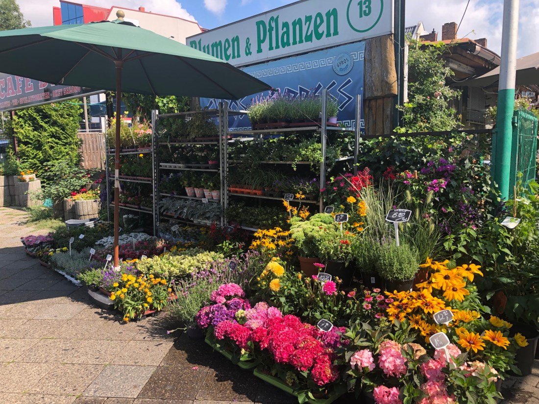 Warm sunny morning and the “Blumen” (flower stalls) all open and selling bright summer flowers. Being in the vicinity of the hospital these line our local streets.
