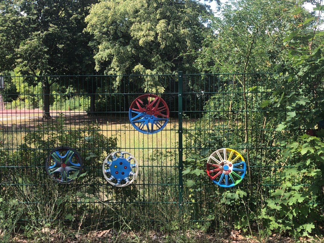 I have been trying to find beauty in this city, and in our walk spotted these painted hubcaps on a school fence….at least it’s colour bordering the overgrown berm.
