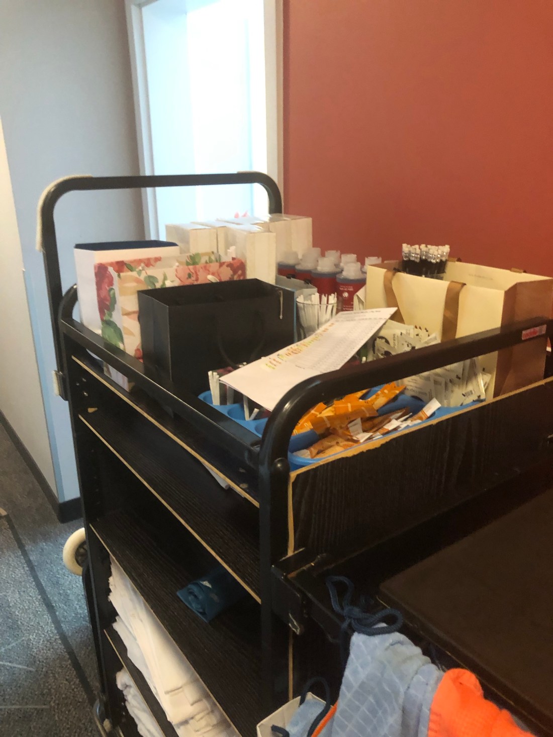 She was thrilled and promptly made new containers, out of our designer bags, for her soaps in one, shampoos in another, tea and coffee supplies in another and so on. Trev, you may recognise some of these on her trolley, the small ones I took to use as handbags!!!