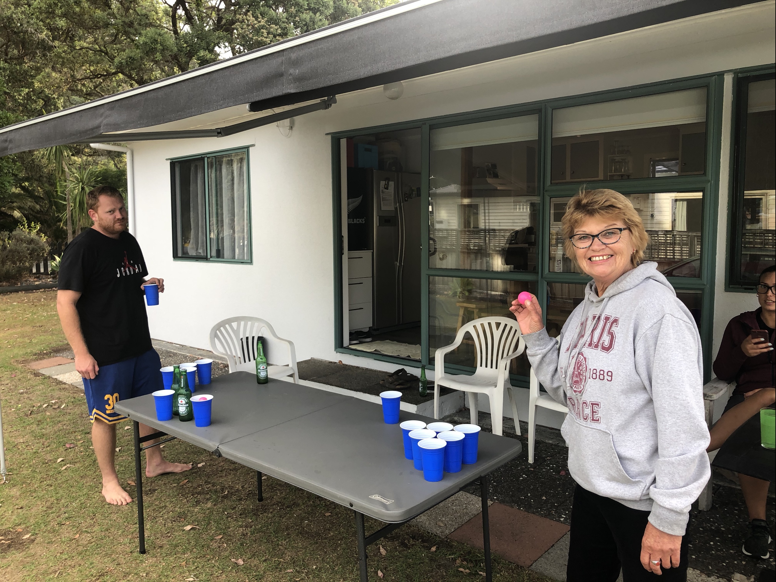 Beer pong on a Saturday night – a whisper of social distancing – beer pong table distance apart.