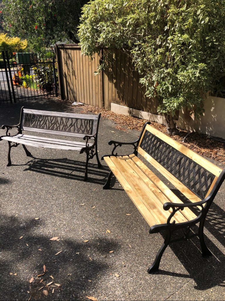 Back to my cottage where George was working, I did a bit of work, it’s very minimal these lockdown days 1-2 hours a day when I have emails to respond to, almost all our clients are not operating during this time. Load of washing, lunch, then the call came to help with the final bolting together of my renovated bench seat!